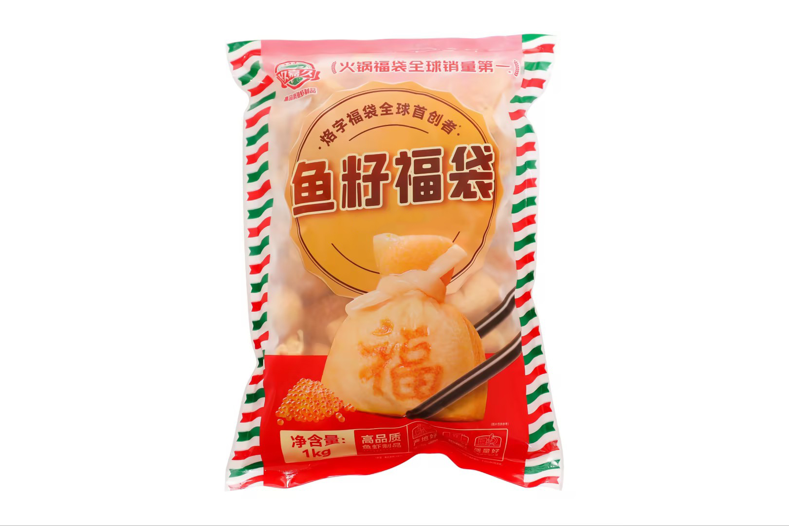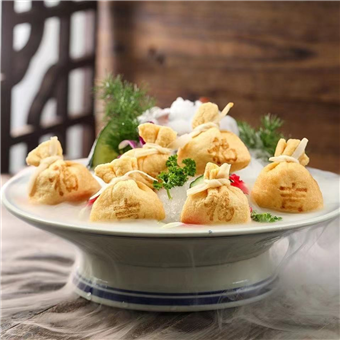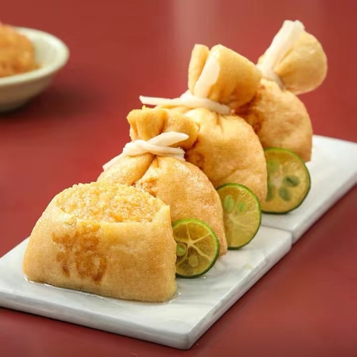 産(chan)品(pin)特性:優(you)質(zhi)豆皮包裹金黄饱满鱼籽,意头十足,形状如袋子(zi)故称福袋,口感滑嫩弹牙,鲜香浓郁!
